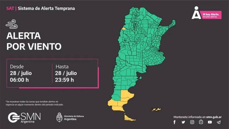 El aviso por viento rige para Tierra del Fuego, las Islas Malvinas y el este y sur de Santa Cruz, donde se esperan vientos del sudoeste con velocidades entre 40 y 60 km/h, y ráfagas que pueden superar los 100 km/h. Además, la costa de Ushuaia se encuentra bajo alerta por nevadas persistentes que pueden acumular hasta 10 cm.