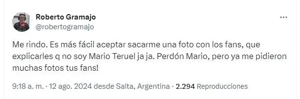 Es que Roberto Gramajo, un reconocido profesor y comunicador, publicó un tuit que nadie esperaba. "Me rindo. Es más fácil aceptar sacarme una foto con los fans que explicarles que no soy Mario Teruel ja ja. Perdón Mario, pero ya me pidieron muchas fotos tus fans", lanzó sobre esta insólita situación que le sucede frecuentemente.