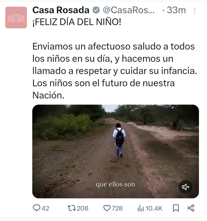 "Enviamos un afectuoso saludo a todos los niños en su día, y hacemos un llamado a respetar y cuidar su infancia. Los niños son el futuro de nuestra Nación”, indica el mensaje de la presidencia junto a un video.