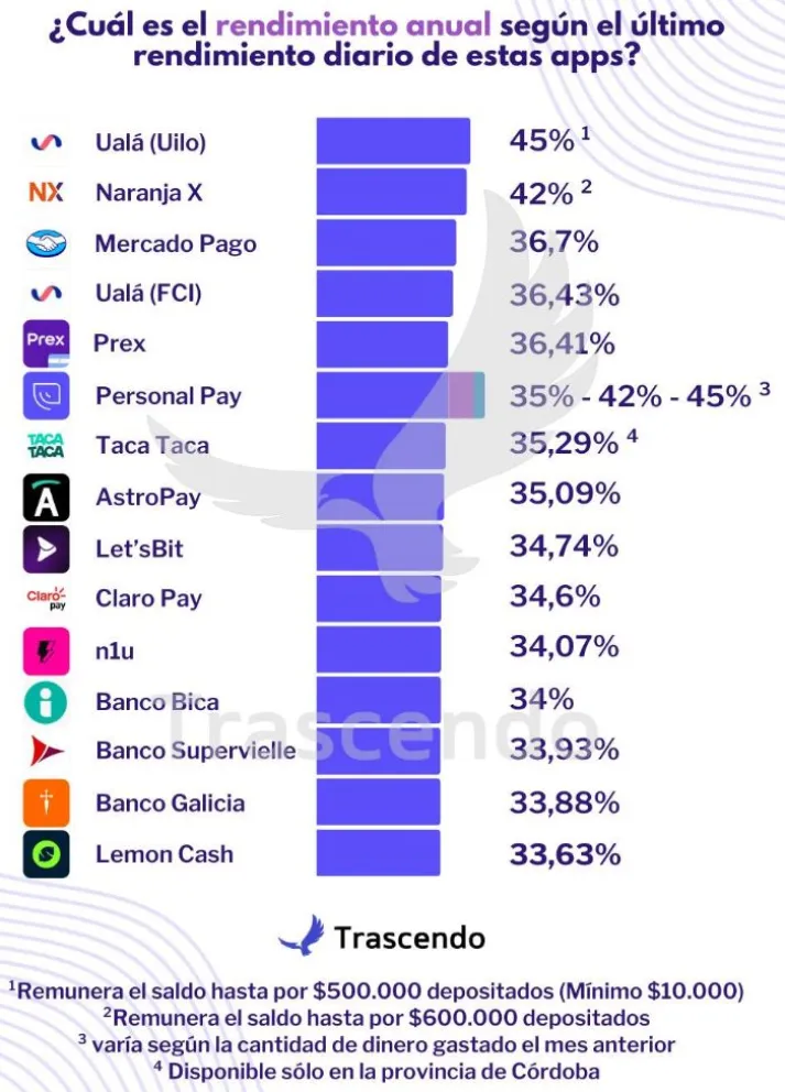 En tanto, Mercado Pago ofrece un rendimiento del 36,7%, según indicó Trascendo.