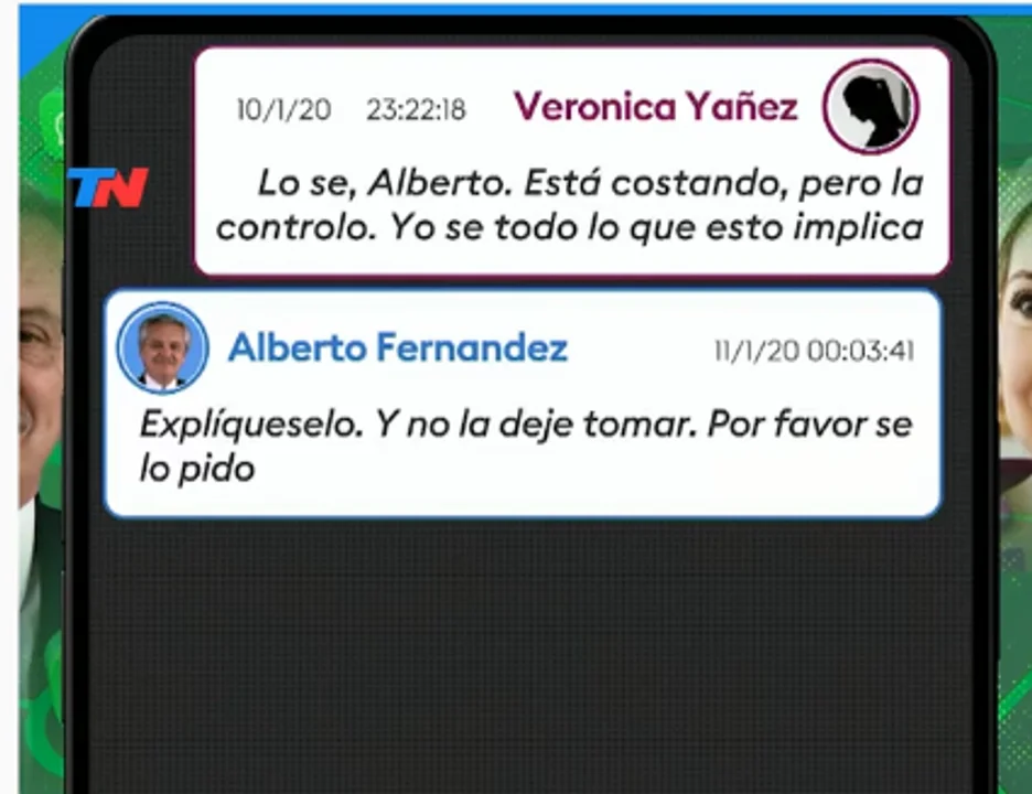 “Hola Verónica, acabo de hablar con Fabiola. Me doy cuenta que estuvo tomando mucho alcohol. Le pido por favor que se ocupe de que no lo haga” se puede leer en uno de los chats difundidos por la señal de noticias TN. “Yo no entiendo porque soy el único que se preocupa por eso”, agrega más adelante el la misma conversación.