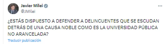 ¿ESTÁS DISPUESTO A DEFENDER A DELINCUENTES QUE SE ESCUDAN DETRÁS DE UNA CAUSA NOBLE COMO ES LA UNIVERSIDAD PÚBLICA NO ARANCELADA?, publicó este domingo al mediodía, acompañando el escrito con un video donde se lo ve dando un discurso sobre el tema. Discurso pronunciado durante la inauguración del Palacio Libertad.