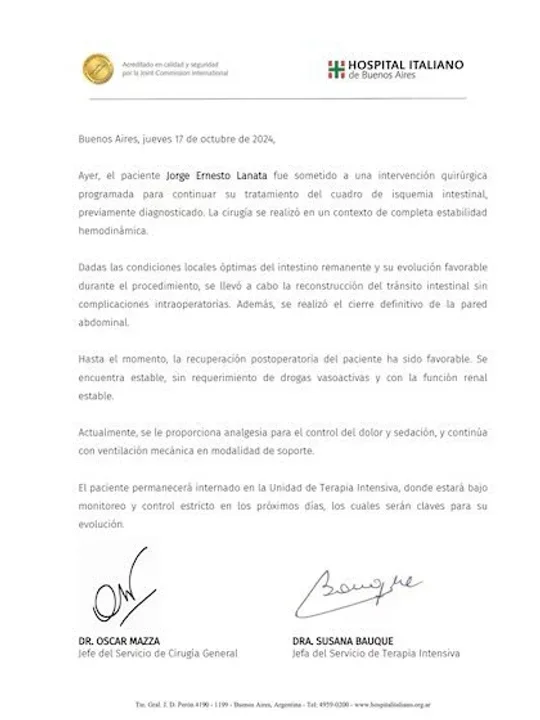 “La cirugía se realizó en un contexto de completa estabilidad hemodinámica dadas las condiciones óptimas del intestino remanente y su evolución favorable durante el procedimiento, se llevó a cabo la reconstrucción del tránsito intestinal, sin complicaciones intraoperatorias”, dice el reporte que lleva la firma del doctor Oscar Mazza, jefe del servicio de cirugía general, junto también a la de la doctora Susana Bauque, jefa del servicio de terapia intensiva.