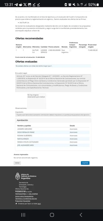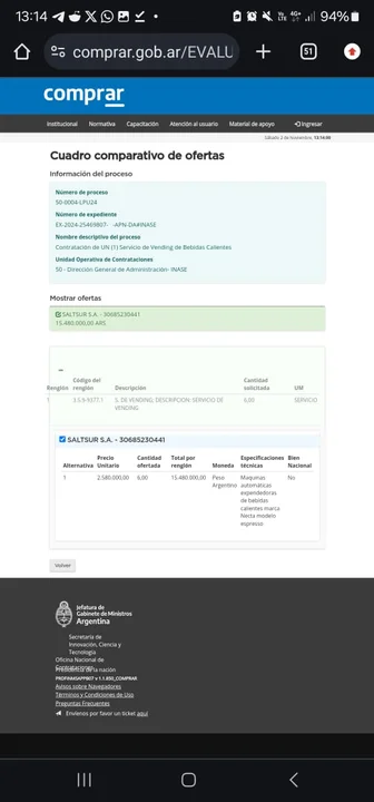 La adjudicación fue realizada a la empresa *SALTSUR S.A., quien ofreció las máquinas automáticas marca **Necta Koro modelo espresso* a un valor unitario de $2.580.000 cada una. En total, la operación significó un desembolso de *$15.480.000*, aprobada formalmente el 24 de julio de 2024 y con una duración contractual de seis meses. Entre los funcionarios responsables de la aprobación se encuentran Leandro Gregorio, Diego Reinaldo Franz, Roxana Silberberg, Nair Alvarado y Joel Alexander Sardi, con la autorización final firmada por Claudio Dunan, presidente del Instituto Nacional de Semillas.