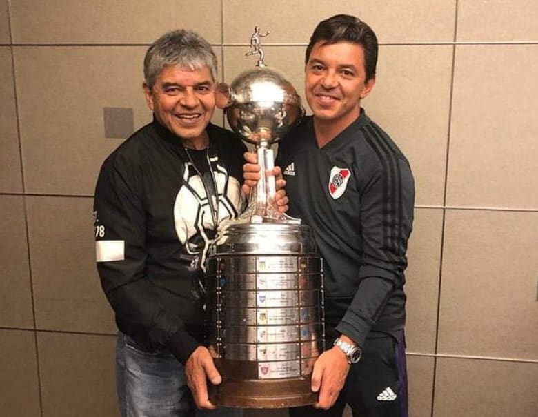 Marcelo Gallardo y su padre, Máximo, con el trofeo de la Copa Libertadores, ganada en la final contra Boca en 2018.