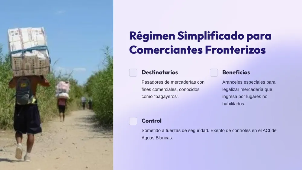 Cabe recordar que el Régimen Simplificado fue diseñado en 2019 por el Ministerio de Seguridad de la Nación, también entonces encabezado por la actual titular de la cartera, Patricia Bullrich, y la AFIP (hoy ARCA) para atender la situación de quienes trabajan en la frontera de Aguas Blancas pasando mercaderías, pero no alcanzó los objetivos trazados por la renuencia que encontró en muchos bagayeros.