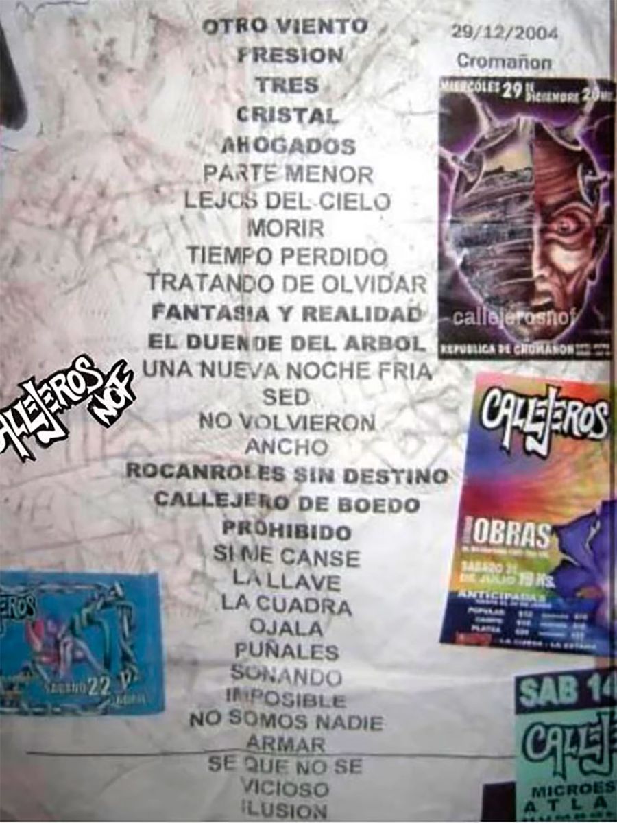 Sobre el escenario, un telón con un cerebro que contiene un planisferio, similar al arte de tapa de Rocanroles sin destino, en el que había trabajado Daniel Cardell, el escenógrafo de la banda, recibió a más de tres mil fanáticos de la banda en cada noche. Entre quienes estuvieron el 29 de diciembre, un día antes que se desatara la masacre que cobró 194 vidas, estaba Soledad Teijeiro, la autora de las fotos que ilustran esta nota y donó, hace pocos días, al Archivo Histórico de la Asociación Civil El Camino es Cultural, que aglutina a muchos de los sobrevivientes de Cromañón.