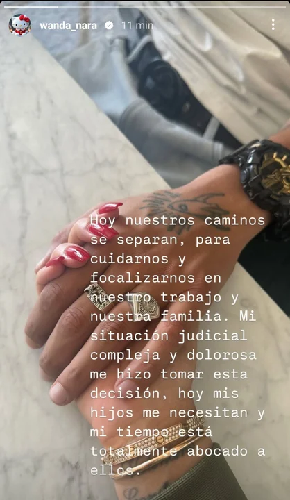 "Hoy nuestros caminos se separan, para cuidarnos y focalizarnos en nuestro trabajo y nuestra familia", dijo la conductora. La situación judicial compleja por la que atraviesa también fue un factor determinante en su decisión. "Mis hijos me necesitan y mi tiempo está totalmente abocado a ellos", concluyó Wanda.