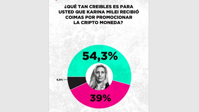 En última instancia, se consultó: "¿Qué tan creíble es para usted que Karina Milei recibió coimas por promocionar la criptomoneda?". El resultado fue 54,3% de acuerdo y 39% a favor (6,8% no sabe).
