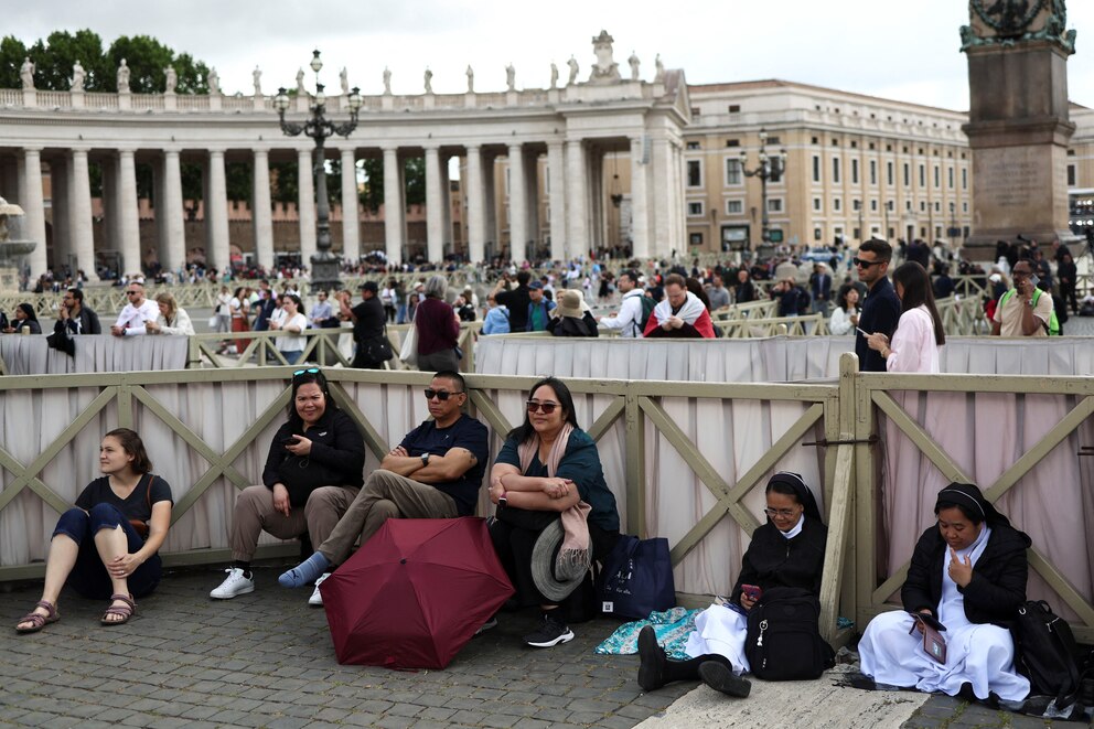 Centenares de personas siguen accediendo por los controles de seguridad para ocupar las primeras filas frente a la basílica, con una vista privilegiada de la pequeña chimenea que sobresale del techo de la Sixtina.