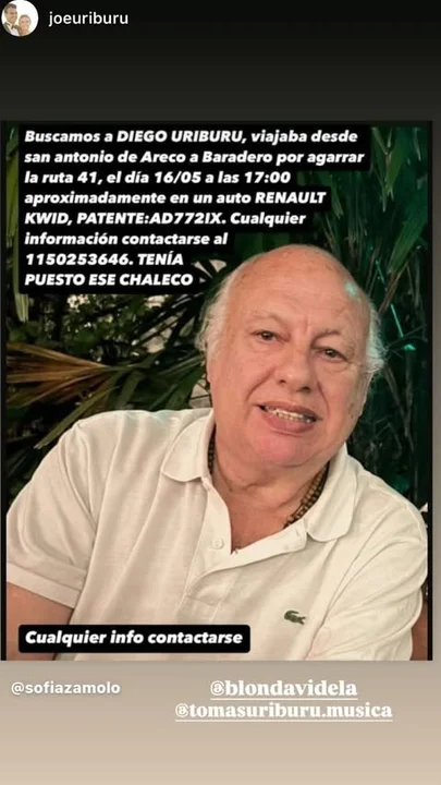 Según supo Noticias Argentinas, Uriburu fue visto por última vez el 16 de mayo cerca de las 17:00, cuando viajaba desde San Antonio de Areco hacia Baradero en un Renault Kwid patente AD772IX.