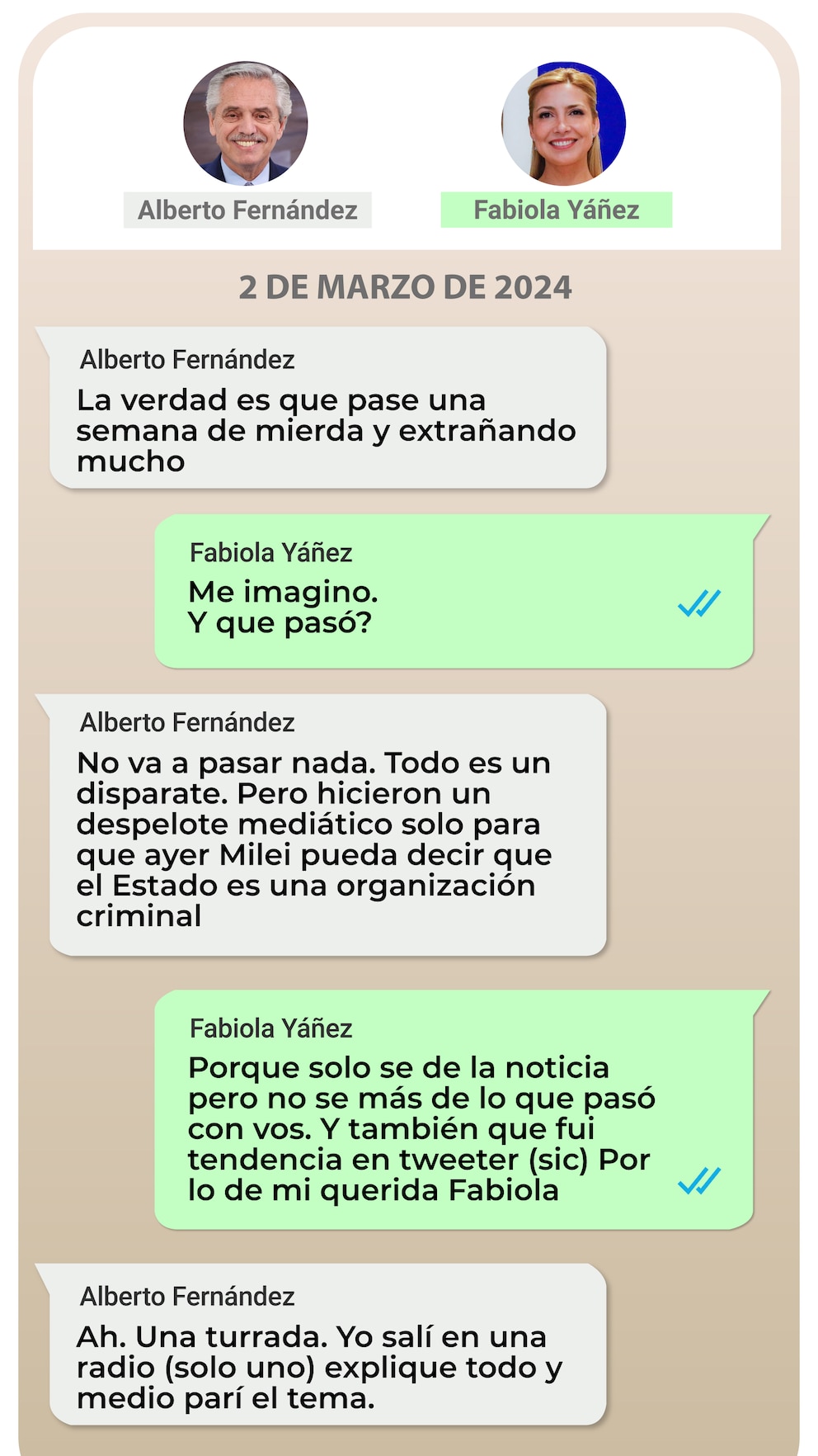En los registros aparece un Fernández colapsado, furioso por las políticas del actual presidente Javier Milei, agobiado por el escándalo de los seguros, en conflicto permanente con Yañez y desbordado emocionalmente. En un mensaje fechado el 2 de marzo de 2024, apenas tres meses después de dejar el poder, lanza: “Si Milei sigue así va a generar una guerra civil”.