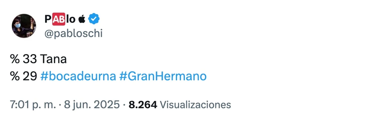 En este marco, una vez más, el reconocido usuario de X (antes Twitter) @Pabloschi lanzó su boca de urna con su predicción sobre quién dejará la casa. El usuario se hizo popular en las redes sociales por sus vaticinios en las galas de eliminación.