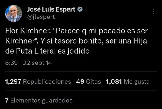 "Flor Kirchner. 'Parece q mi pecado es ser Kirchner'. Y si tesoro bonito, ser una Hija de Puta Literal es jodido", dice el tuit original fechado del 2 de septiembre.