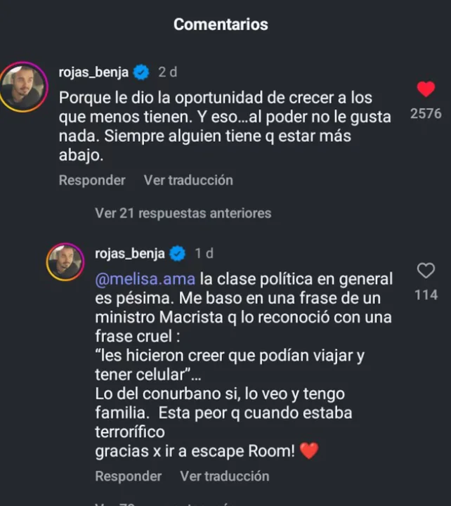 Uno de esos comentarios cuestionó puntualmente el estado del conurbano bonaerense como contraargumento a su defensa de la exmandataria. Lejos de esquivar la crítica, Rojas respondió con firmeza y amplió su análisis: “La clase política en general es pésima. Me baso en una frase de un ministro macrista que lo reconoció con una frase cruel: ‘les hicieron creer que podían viajar y tener celular’”.
