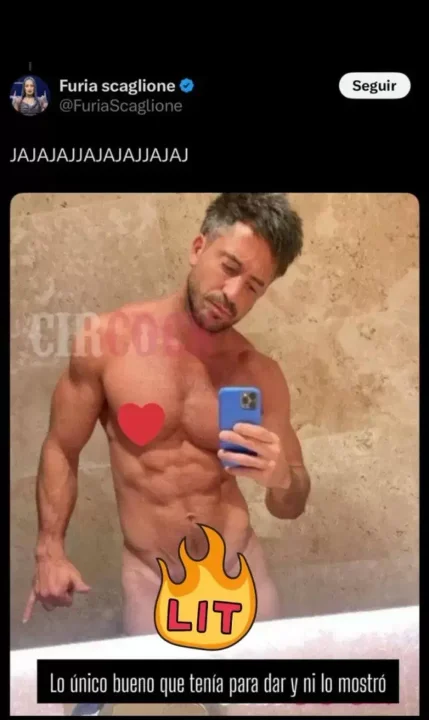 Mientras la casa esperaba la resolución entre Selva y Devi, la polémica explotó fuera del reality. Juliana "Furia" Scaglione, ex participante y una de las figuras más mediáticas de la edición pasada, publicó en su perfil de X (ex Twitter) una foto filtrada de Devi completamente desnudo, sin censura, acompañada de un mensaje irónico: "Lo único bueno que tenía para dar y ni lo mostró".