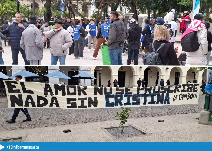 En simultáneo con manifestaciones en distintos puntos del país, decenas de salteños se concentraron en plaza 9 de Julio para manifestar su apoyo a la expresidenta Cristina Fernández de Kirchner, luego de que se confirmara su condena a prisión domiciliaria con tobillera electrónica.