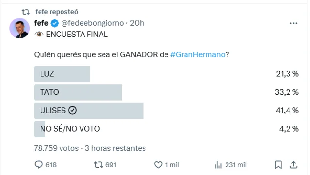 Con el 41,4 % de 78.759 votos en X, Ulises lidera la encuesta de Fefe Bongiorno (LAM). Tato suma 33,2 % y Luz 21,3 %; el sondeo cierra esta noche.