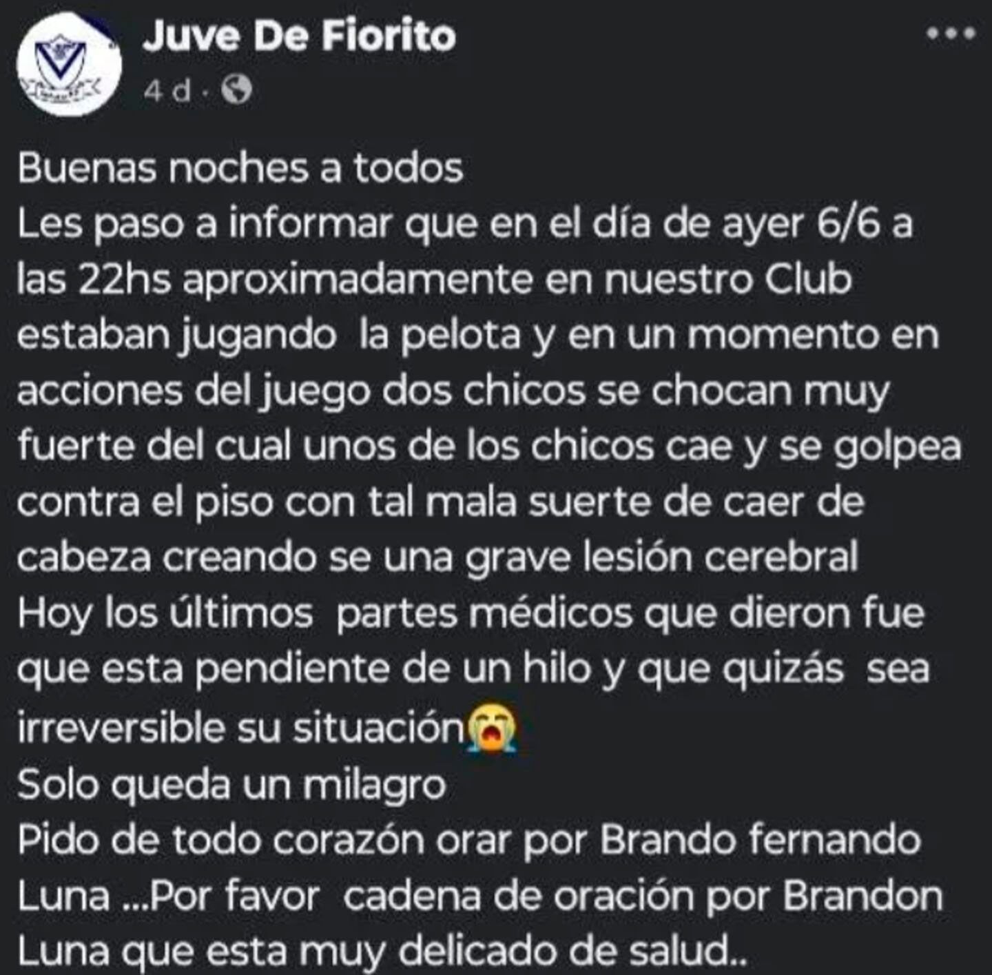 Desde el club, a través de un comunicado, explicaron que los jóvenes “estaban jugando a la pelota y en un momento en acciones del juego dos chicos se chocan muy fuerte“. Luego indicaron que ”uno de los chicos cae y se golpea contra el piso con tal mala suerte de caer de cabeza, creándose una grave lesión cerebral".