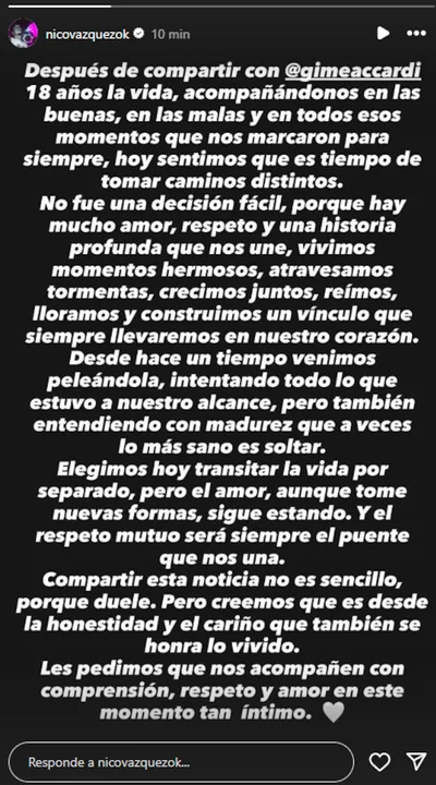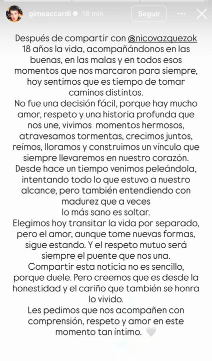 “Después de compartir con @nicovazquezok 18 años la vida, acompañándonos en las buenas, en las malas y en todos esos momentos que nos marcaron para siempre, hoy sentimos que es tiempo de tomar caminos distintos”, comenzó explicando la actriz en una historia que replicó de su par.