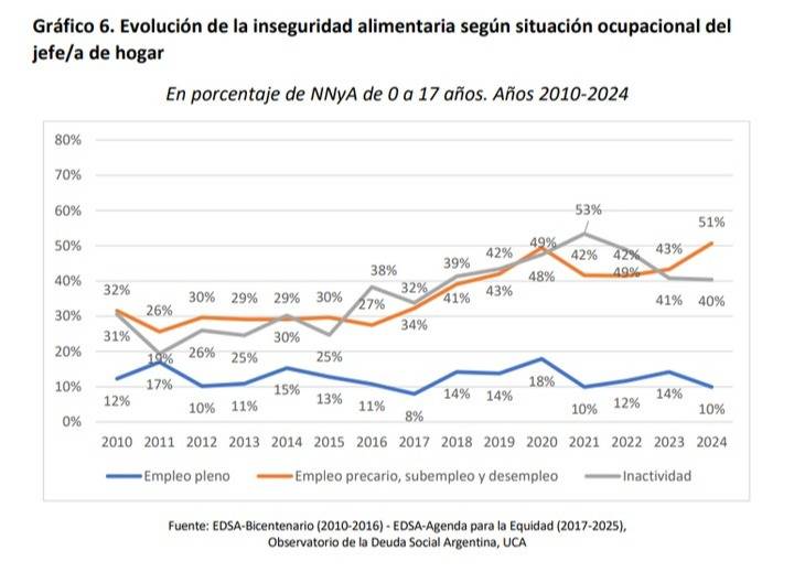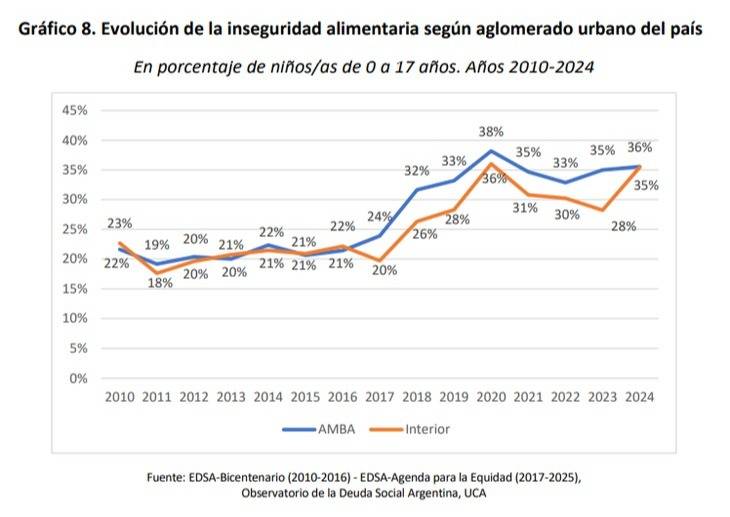 El estudio, titulado "Inseguridad alimentaria en la infancia argentina: un problema estructural observado en la coyuntura actual", advierte que si bien la pobreza, el empleo precario y la desigualdad son factores históricos, la situación empeoró en los últimos años. Entre 2010 y 2024, la tendencia fue ascendente, con picos en 2018, durante la pandemia en 2020 y en la crisis socioeconómica del último año.