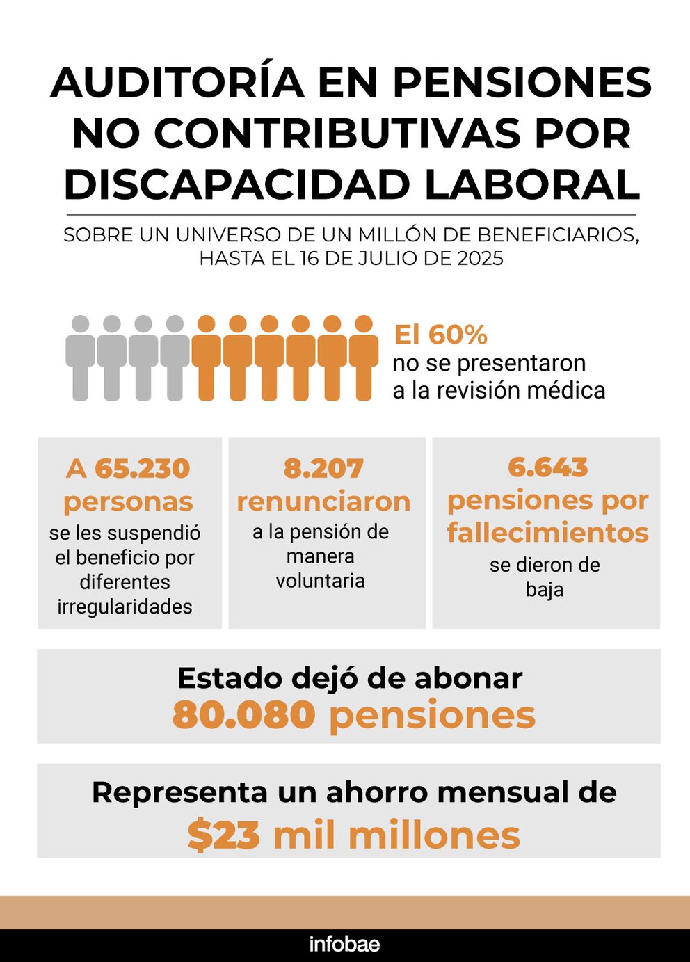 En total, el Estado dejó de abonar 80.080 Pensiones No Contributivas por Discapacidad Laboral. Solo esas bajas significan un ahorro de más de 23 mil millones de pesos mensuales, exactamente $23.143.120.000.