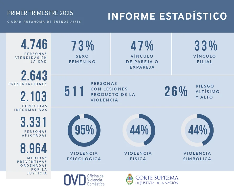 En el primer trimestre del año, los equipos interdisciplinarios de la Oficina de Violencia Doméstica (OVD) de la Corte Suprema de Justicia de la Nación recibieron 2.643 presentaciones, un 9% más que en igual período del año anterior, que alcanzaron a 3.331 personas afectadas.