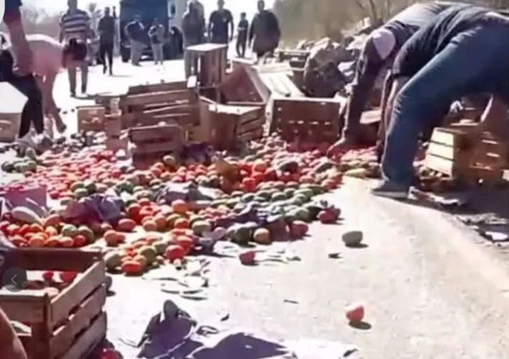 Sin embargo, por circunstancias que faltaban esclarecerse, el camión terminó perdiendo su carga y la mercadería se desparramó por la ruta, con los cajones de madera regando de tomado y demás hortalizas el pavimento.