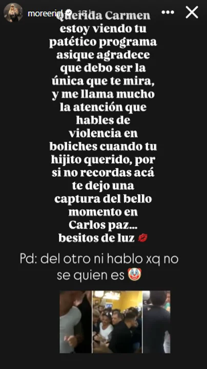 Es que la influencer le dedicó una publicación en donde trató “Con Carmen”, el programa en donde trabaja la conductora, como “patético” y apuntó: “Me llama la atención que hables de violencia en boliches, cuando tu hijito querido -Federico Bal- (...)”.