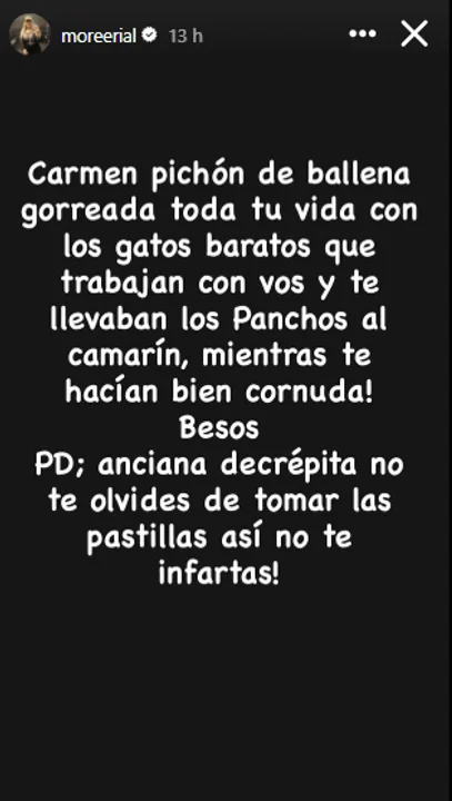 “Carmen, pichón de ballena gorreada, toda tu vida con los gatos baratos que trabajan con vos y te llevan los panchos al camarín, mientras te hacían cornuda. Ancciana decrépita, no te olvides de tomar las pastillas así no te infartás”, cerró Morena.