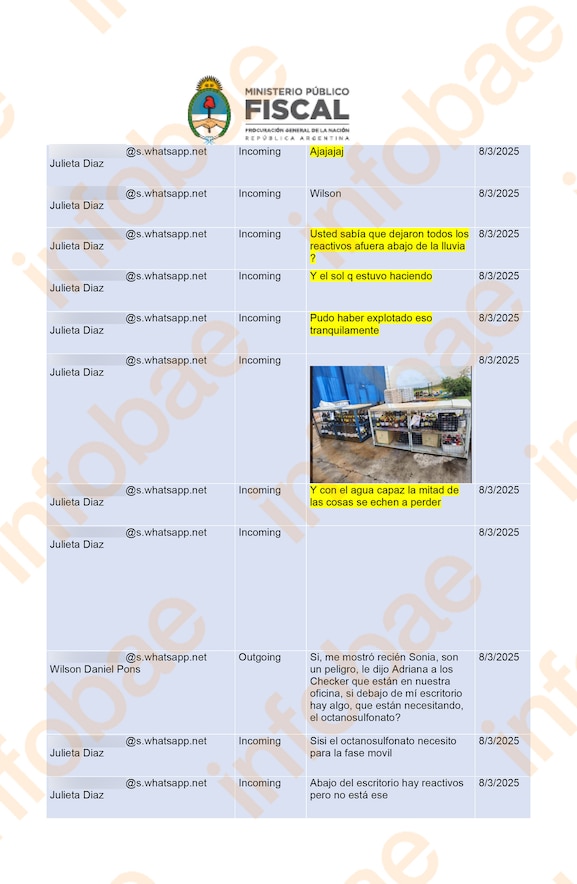 “El análisis de los chats extraídos del dispositivo de Wilson Daniel Pons (director técnico buena parte del 2024) permite inferir que los directivos y jefes conocían inspecciones próximas, movimientos internos irregulares y ocultamiento de reactivos y solventes”.