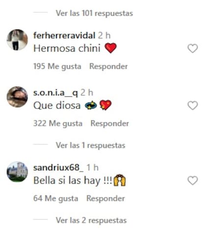 A la par que el mensaje del futbolista, otros usuarios también plasmaron allí sus opiniones al respecto. Algunas de las más destacadas fueron: “Sos extremadamente hermosa y eso le duele a muchas”; “Hermosa Chini”; “Qué diosa”; “Bella si las hay”; “Qué lindo ese vestido, te queda muy bello” y “Sin palabra, una reina”. Ese posteo cosechó en pocas horas más de 150.000 “Me gusta”.