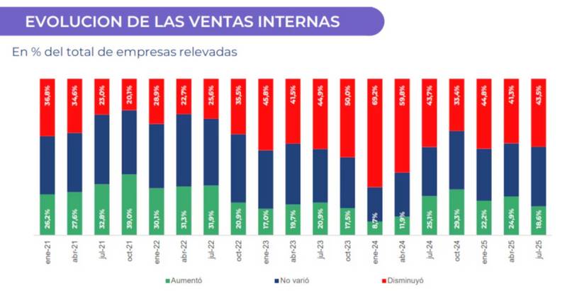 En esa línea, el 43,5% de las empresas mostró una caída en sus ventas internas, mientras que el 18,6% reportó aumentos. Con estos datos, la brecha entre ambos grupos aumentó en comparación a abril 2025 y julio 2024.