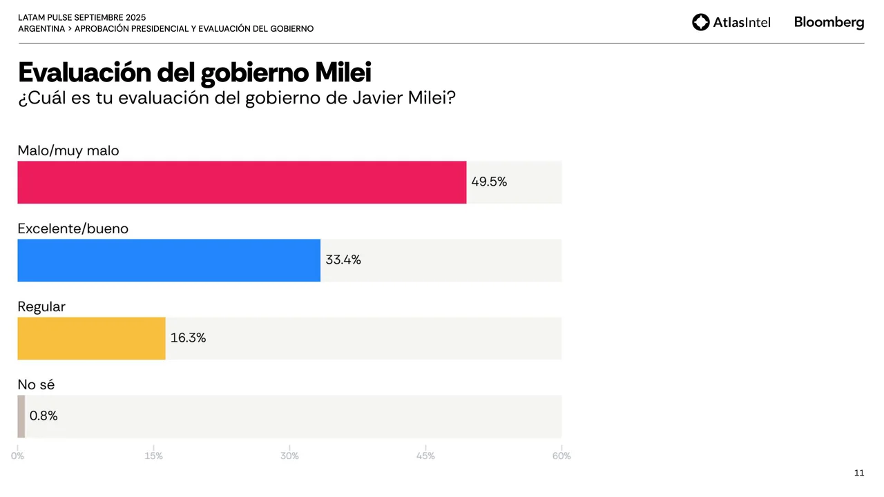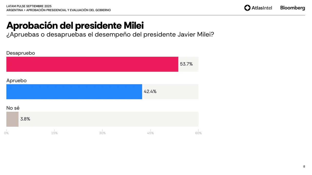 Una nueva y extensa encuesta de la consultora AtlasIntel en conjunto con Bloomberg revela un significativo deterioro en la imagen del presidente Javier Milei y su gobierno, marcando el punto más alto de desaprobación de su gestión. Según el sondeo, la desaprobación de Milei alcanzó el 53,7% en septiembre, mientras que su aprobación cayó al 42,4%.