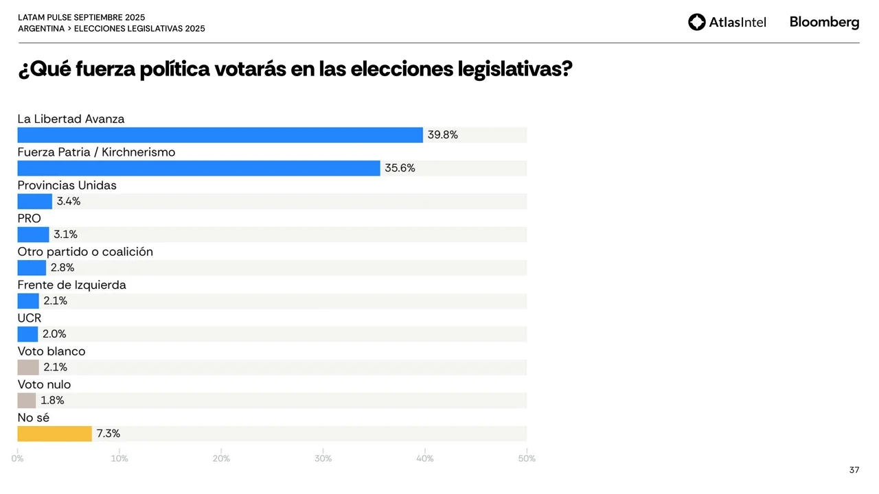 La Libertad Avanza todavía lidera la intención de voto a nivel nacional con un 39,8%. En segundo lugar se ubica Fuerza Patria o el kirchnerismo, con un 35,6%. Esto sugiere que, si bien una porción del electorado le ha quitado su apoyo al Presidente, aún no encuentra una alternativa convincente en la oposición.