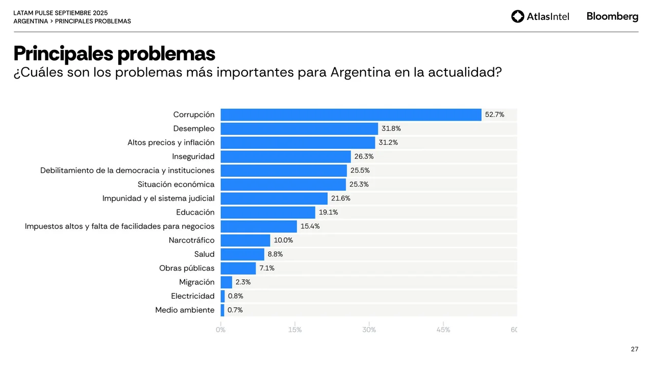 El dato más alarmante para el Gobierno es la razón detrás de esta caída: la corrupción se disparó como el principal problema del país para el 52,7% de los encuestados, superando por primera vez y por un amplio margen al desempleo (31,8%) y a la inflación (31,2%). Según supo Noticias Argentinas, este salto en la preocupación por la corrupción es una consecuencia directa de los escándalos de las últimas semanas, como el de la ANDIS.