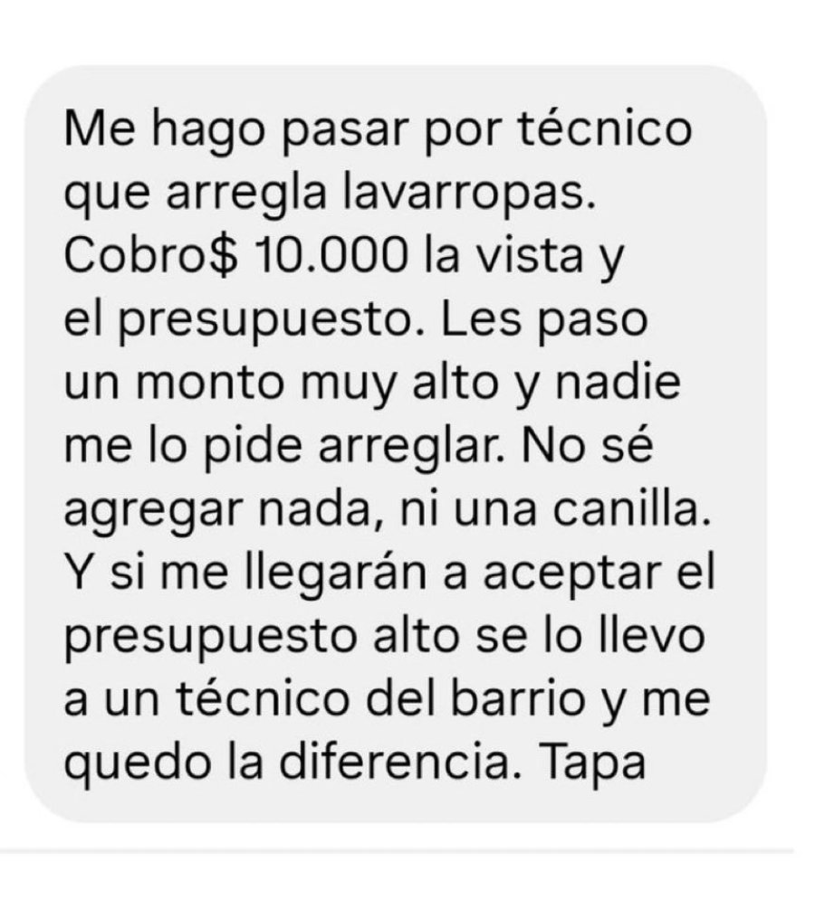 Un relato subido a Instagram encendió las redes: un hombre describió con tono jactancioso su modalidad para “ganarse el pan”: se presenta como técnico de lavarropas, cobra $10.000 por la visita y el presupuesto, ofrece un presupuesto inflado —“tan alto que nadie lo pide arreglar”— y, si finalmente lo aceptan, manda al trabajo a un verdadero técnico del barrio quedándose con la diferencia.