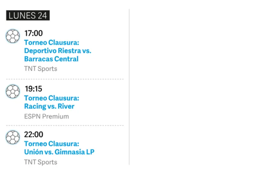 El morbo futbolístico llegará el lunes con Racing–River, reedición del reciente choque en Copa Argentina. El partido se jugará a las 19.15, en un contexto cargado para el equipo de Marcelo Gallardo, que necesita ser campeón para asegurar su lugar en la próxima Copa Libertadores.