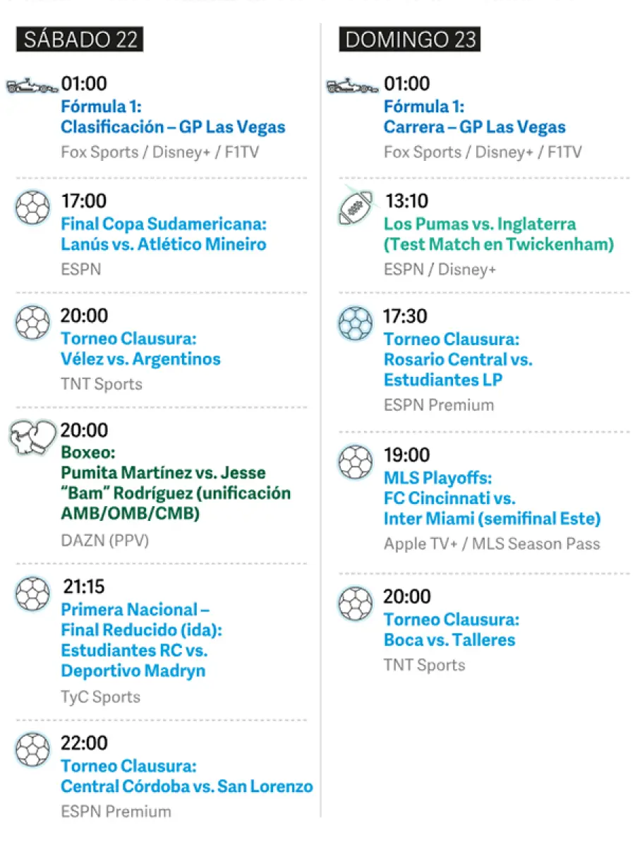 Desde Lionel Messi hasta Franco Colapinto, pasando por los octavos del Torneo Clausura y Lanús en la final de la Copa Sudamericana, además de Los Pumas contra Inglaterra o el Pumita Martínez en un combate histórico en Riad. Todo en todas partes al mismo tiempo, en una agenda que viajará de Italia a Las Vegas y de Twickenham a Miami.