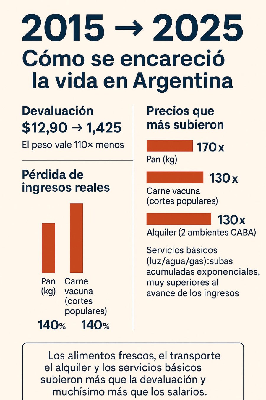 Entre 2015 y 2025, la economía argentina atravesó el período más prolongado de caída del poder adquisitivo desde 1983. En apenas una década, el peso se devaluó más de 11.000%, mientras salarios, jubilaciones y haberes mínimos crecieron muy por debajo de los precios.
