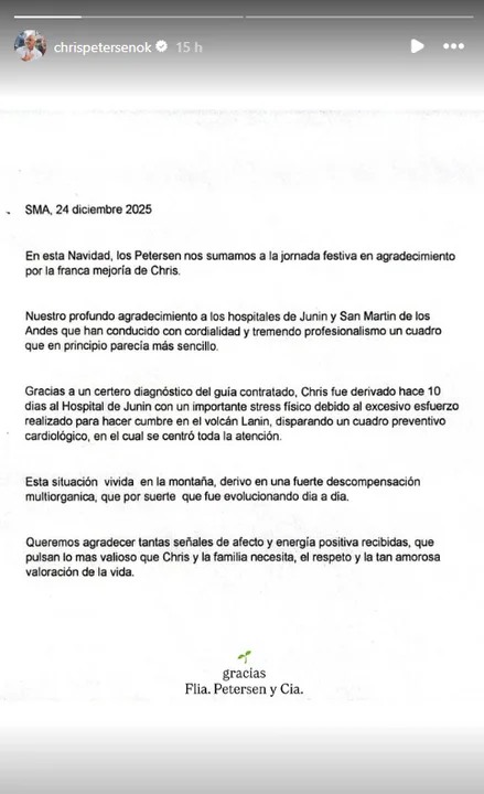 El texto, que fue compartido a través de las historias de Instagram de la cuenta del chef, dice: “En esta Navidad, los Petersen nos sumamos a la jornada festiva en agradecimiento por la franca mejoría de Chris”, expresaron.