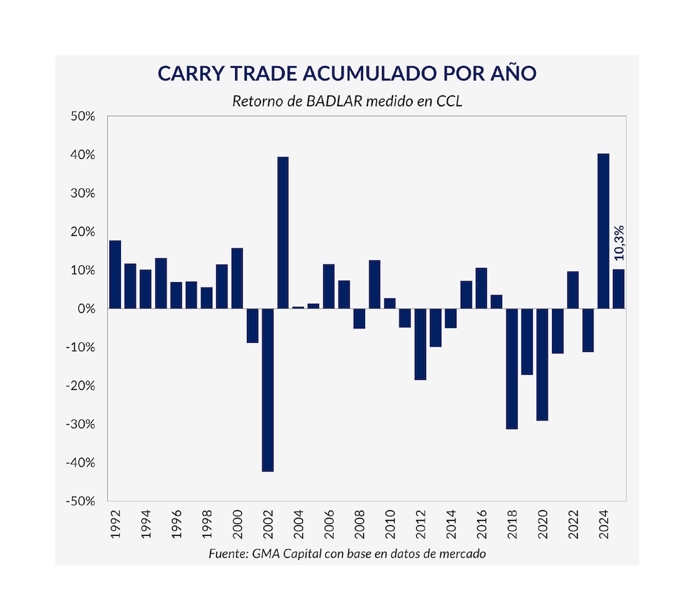 En 2025, el carry trade logró un retorno total del 10,3% en dólares contado con liquidación (CCL) pese a la marcada volatilidad de los mercados financieros argentinos y la inestabilidad del tipo de cambio. El análisis difundido por GMA Capital, la consultora dirigida por Nery Persichini, reveló que la estrategia de inversión basada en aprovechar tasas locales cortas volvió a dar resultados positivos luego de un 2024 excepcional, cuando este tipo de operatoria arrojó un rendimiento del 40 por ciento. Aunque, a diferencia de lo que sucedió el año pasado, en este 2025 la estrategia de apostar por ganancias en dólares con tasas en pesos fue exclusivamente para valientes.