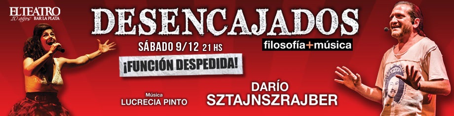 Cultura10/04/2015Gracias a la gran concurrencia del público y al éxito en la venta de entradas, esta noche, el show de filosofía y música se llevará a cabo con doble función, a las 21.30 hs., en El Teatrino (Aniceto Latorre y Alvear). La entrada tiene un valor de $150.“Desencajados: Filosofía + Música" es un diálogo de desmontaje. El show está a cargo de Darío Sztajnszrajber (filosofía) + Lucrecia Pinto, Guillermo Martel, Lucas Wilders y Juan Finger (música).Spinetta, Charly García y Fito Páez dialogando con Platón, Nietzsche y Derridá. ¿Cuál puede ser el resultado de un encuentro entre la filosofía y la música, sino el del sonido de un pensamiento que danza?