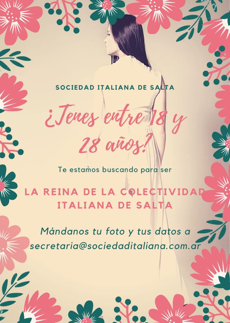 La Sociedad Italiana de Salta convoca a jóvenes salteñas, descendientes de italianos, para participar en la elección de la reina de la colectividad que reside en nuestra provincia.
