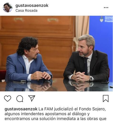 El intendente Gustavo Sáenz dialogó con el ministro del Interior, Rogelio Frigerio y le expresó su preocupación respecto a las obras que se ejecutan con el dinero de dicho fondo. "Apostamos al diálogo y encontramos una solución", adelantó el jefe comunal capitalino.