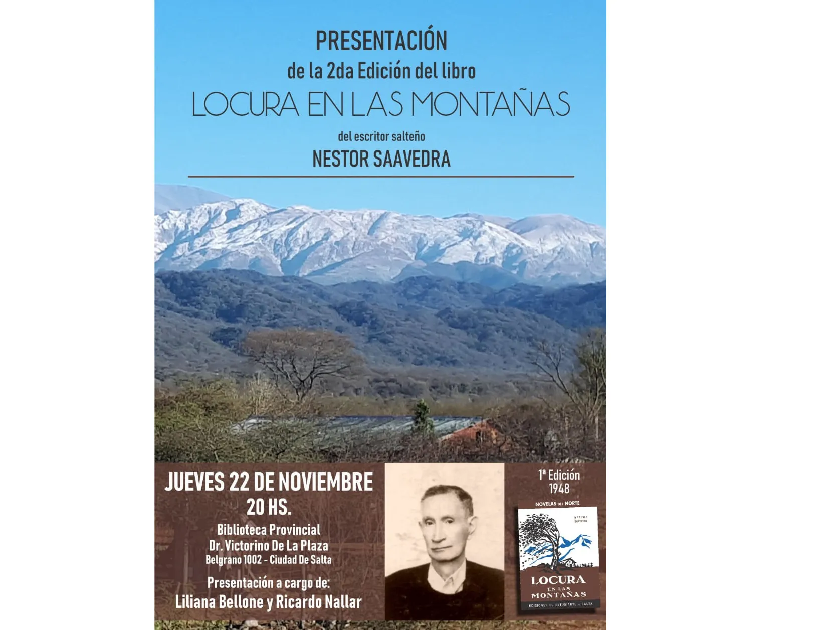 Siendo uno de los autores más prolíferos de nuestra tierra, Néstor Saavedra publicaba, allá por 1948 la primera edición de su novela “Locura en las montañas”. La misma fue reeditada con el auspicio del Fondo Editorial de la Secretaría de Cultura de la Provincia y tendrá su presentación oficial esta noche en el Complejo de Bibliotecas y Archivos (Avda Belgrano 1002).